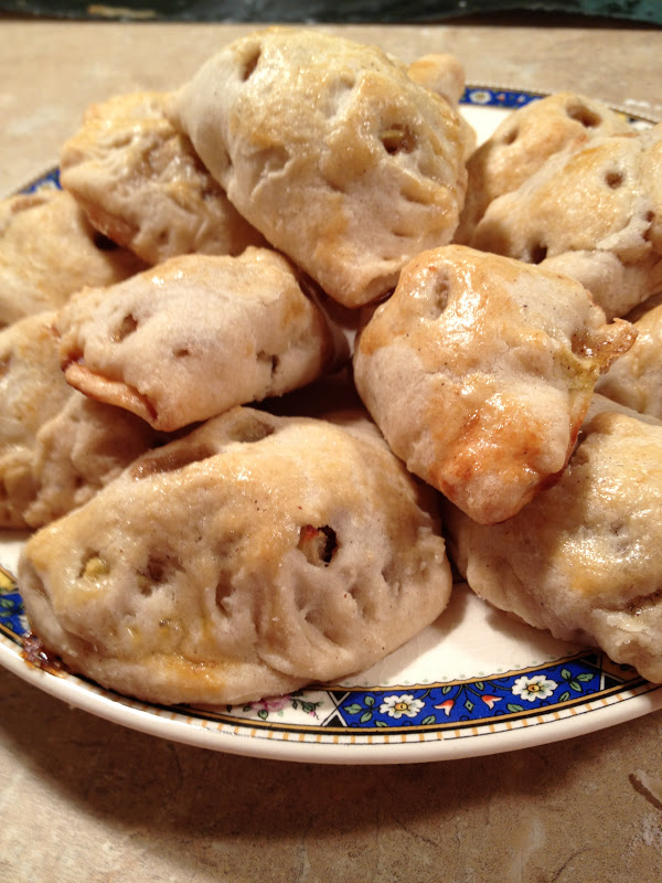 - Prepare the filling: Peel, core, and chop the apples. {Note: Since the pies are small, try not to keep the apple pieces relatively small. In fact I grated mine and it worked out a lot better} Place the chopped (or grated) apples into a medium-size bowl. Add the lemon, sugar, flour, salt, cinnamon, allspice, and ginger. Stir everything together until evenly coated. Cover the bowl as you roll out the dough.